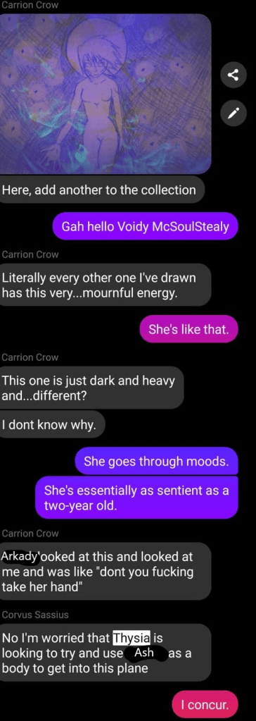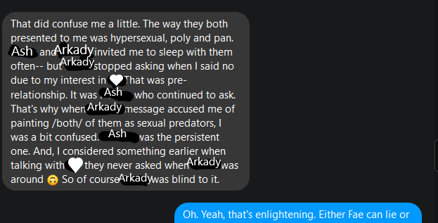 I’ll admit, in the summer of 2019, when I’d heard Spectre had been calling Rowan and Arkady sexually predatory, I doubted it mainly on Arkady’s behalf. He was like me, at the time. Ricocheting between hypersexual and sexually-repulsed. But on Rowan’s behalf… ah… I could see it.