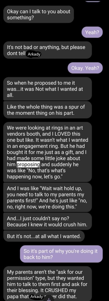 They even went on to me about how Arkady had proposed in a way that was– less than ideal. I repeat, Rowan was engaged to one of the most amazing people I have ever met and, because Arkady did it impulsively, or did it without their parents’ blessing, Rowan resented it.