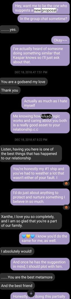 As much as I hated myself for doing this, I agreed to try to subtly sway Arkady into doing a ‘new proposal.’ After all, Rowan was beginning their transition, looked different than they had during their first engagement photos– all good points for a ‘do-over.’