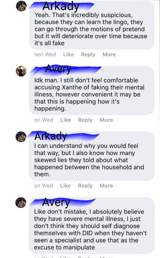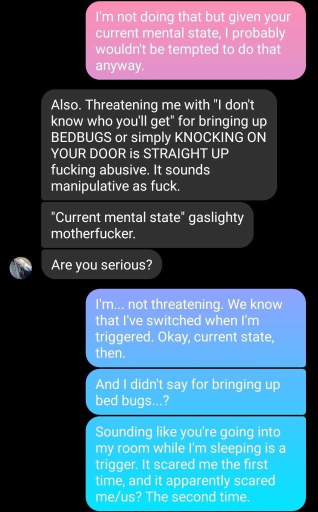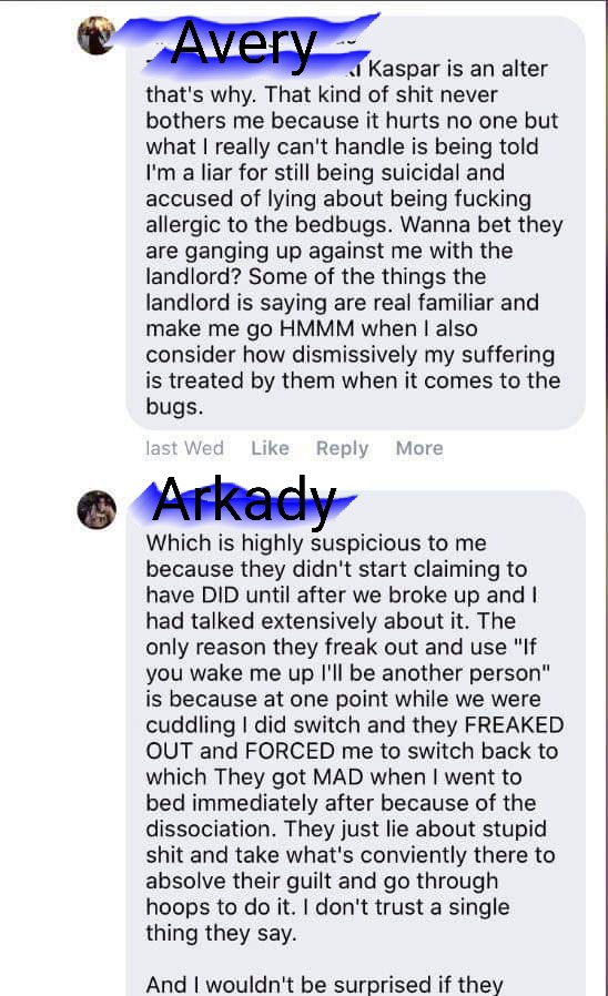 Arkady, saying that alters are “OCs” in reference to me confusing what belonged to who during a party? For the record: I actually don’t remember the whole ‘face wash fiasco.’ Not to say that I wasn’t there for that, just that it was such a mundane confusion that I’d have no idea it’d be the smoking gun in this flimsy case. I also didn’t tell AJ they were faking an allergy– I did say they were a liar for being suicidal, because they promised me They Wouldn’t Be, and that’s the reason I let them move in with me. Come to find out, they’d had a long-standing plan to commit suicide for things unrelated to anything I could ever help.