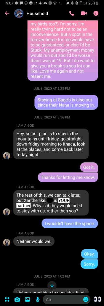 then “AJ! Small change of plans. We’re actually all moving to Ithaca! Well, [Arkady], Vali, and I are all living together. You and Xanthe will have to find somewhere nearby to live.” When I protested the obvious difference between four people splitting three incomes, and two people on one income, Rowan said to me, “Xanthe, they’re YOUR partner.”
