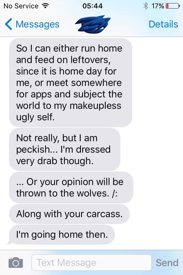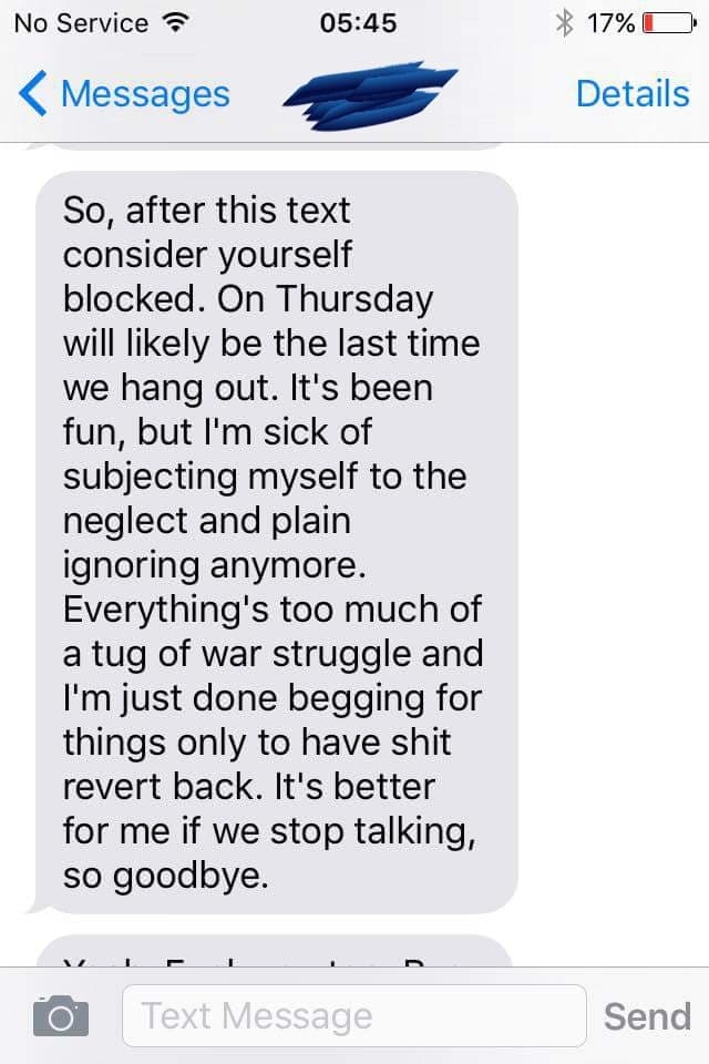 I checked my phone later that night. Aberle texted me, saying he had gotten a text from someone saying he was Ryuuga, that Kirra had attempted suicide and was in the hospital in critical condition. Here we go. I’m about to get ’13 Reasons Why’d’ all over fucking Facebook. I texted Cotton. “Hey, where is Kirra right now?”