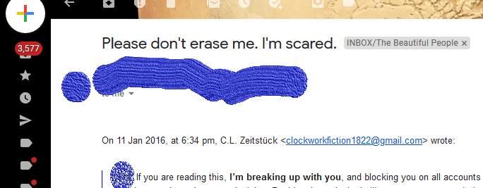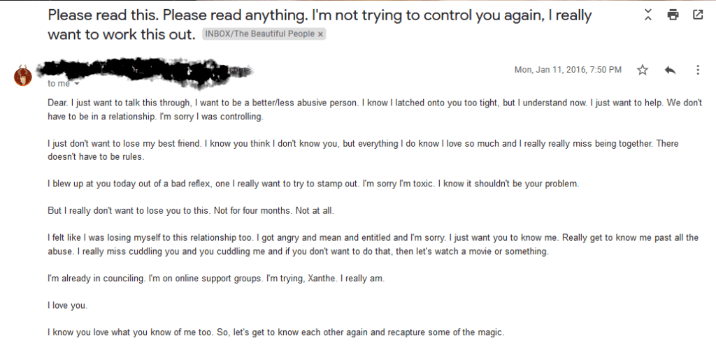 (TW: toxic relationships, abuse, break ups, discussions of suicide, feelings of worthlessness. As per usual, any narration in exclusively Italics takes place in the system’s inworld. The emails mentioned, both the one I originally crafted and thought I sent and the email Xhaxhollari originally sent are here, in case you need a refresher. https://living-fiction.com/2021/07/21/both-break-up-emails-in-full-circa-2015/)