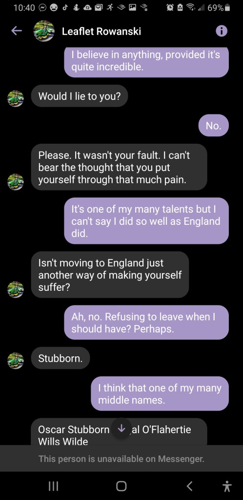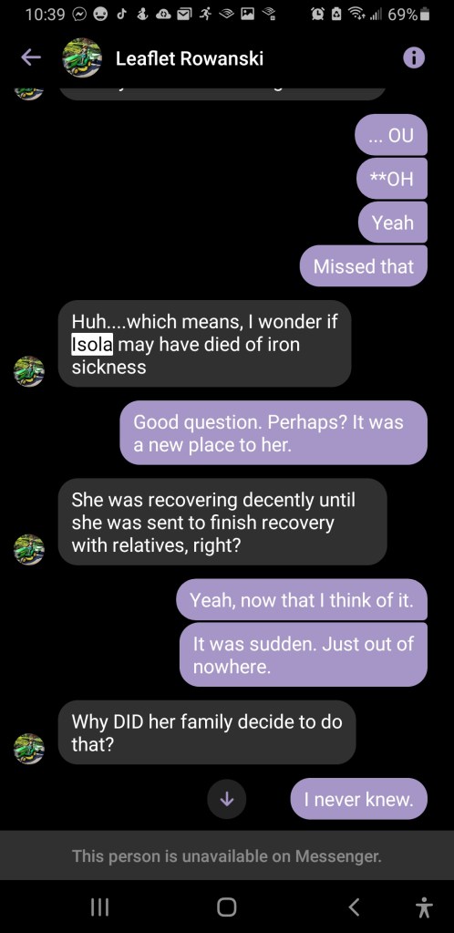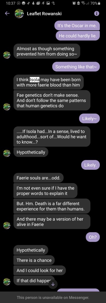 Rowan claimed to channel Isola Wilde, which was something that visibly strained Oscar to know. I think Rowan was gunning for some sort of grand reunion, but my introject alter seemed deeply disturbed that his beloved sister wasn’t at peace after all. I wish I had known that at first.