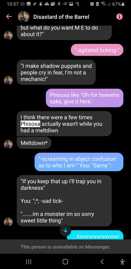He had apparently been there for my inworld childhood– for that in-between phase when I had outgrown my clock and my soul was in a clockwork crow. He even recounted stories of how I would screech like a tea kettle if I grew distressed or malfunctioned, and how he had briefly lived with Phisoxa.