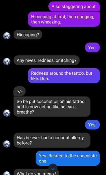 Apollo picked up on my question with a pained, jerky nod. “Yeah– coconut– it’s in the same family as cocoa– so–” he gasped again, audibly gulping for breath. Kara sprang to action, fetching him a damp cloth, a glass of water, proclaiming herself for having been trained as a nurse. (Which, I never did find out if that little factoid was true or not, but knowing my life…)