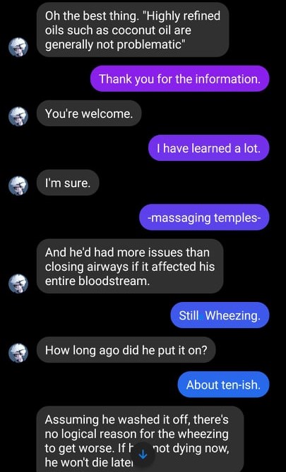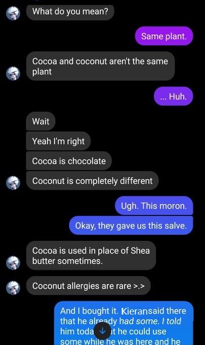 Frowning, I fished out the tin. And then I saw it. “Oh, shit. Coconut oil. Is that related to–?” I was hesitant to reference it, as Kara was right there, but what I was thinking of was that the Methusilla vampires of ‘the other plane’ were allergic to chocolate. Nope, not garlic. Chocolate. Don’t ask, I don’t know why either.