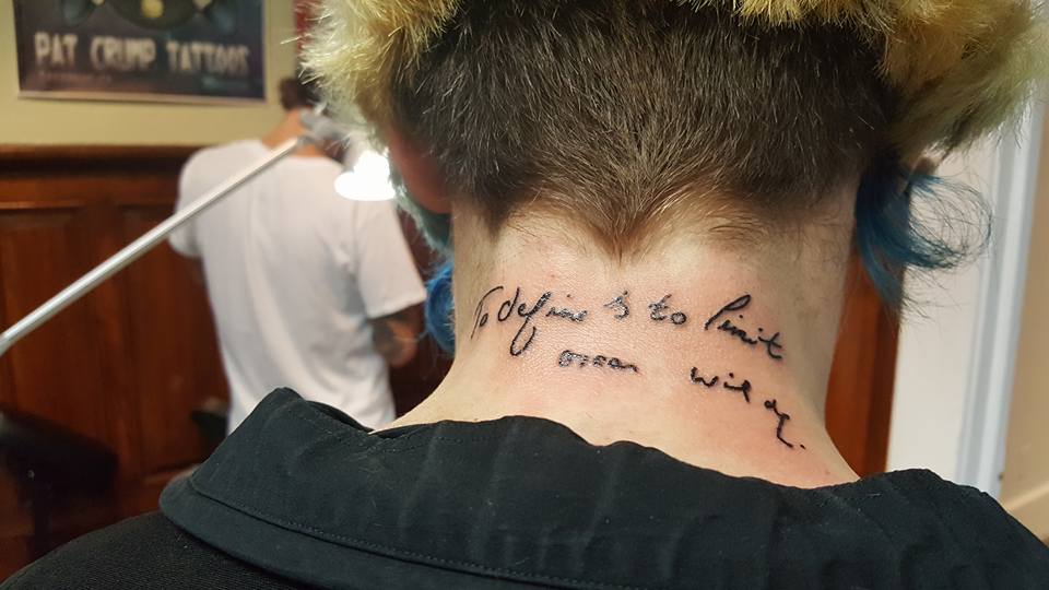 All Kara wanted was something low-key– pizza and drinks and watching telly at my place. That, I could definitely do. All I wanted to do on Oscar Wilde’s birthday was get a quote of his tattooed on my neck, which I did. “I should get more of my quotes tattooed on me!” I said. Then paused. “Um. More of his quotes, I meant.”