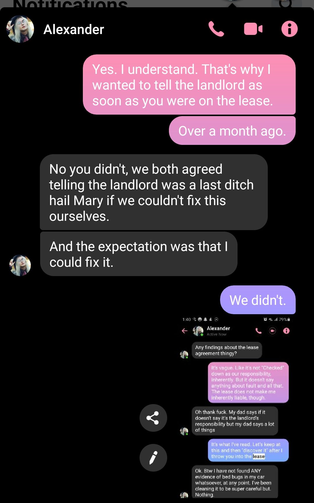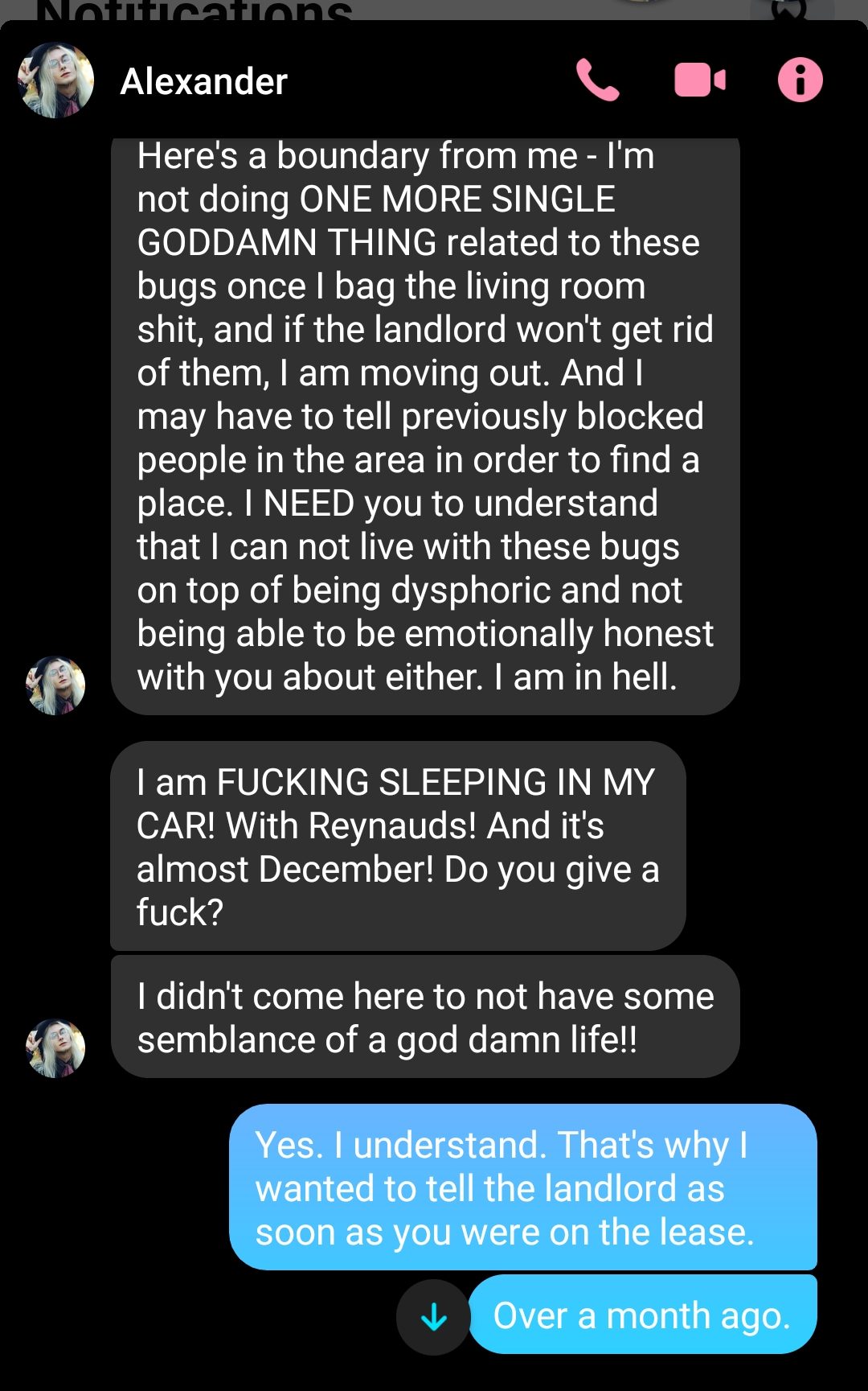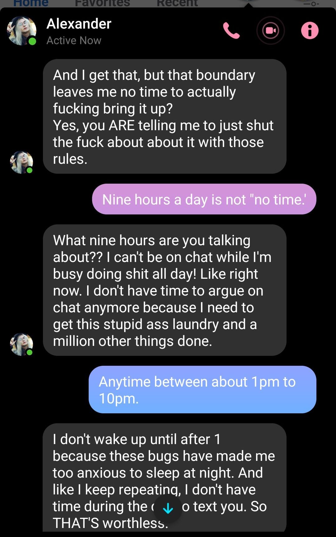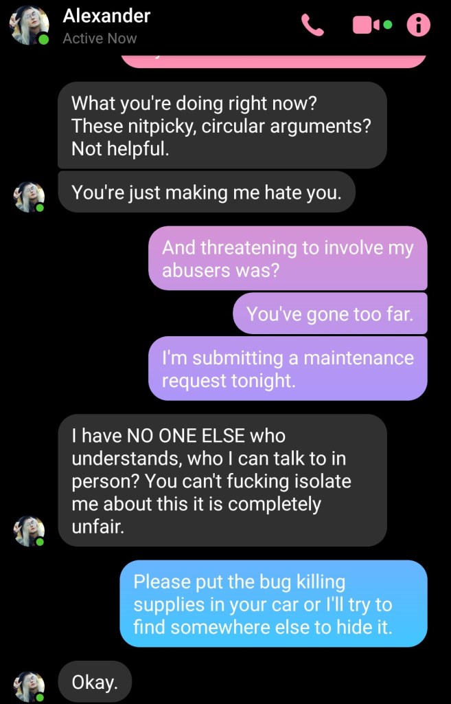 This didn’t exactly bode well for our relationship. I remember when we had one particular argument through text when I was at work– it was the usual. ‘I’m doing so much work!’ ‘I’d rather you not. The landlord’s setting us up with an exterminator.’ ‘I need to talk about my problems. I hate having to do all this work.’ ‘Okay, I’m equal to that nine hours a day.’ ‘NOT GOOD ENOUGH. ABUSIVE. YOU’RE LIKE MY MOM.’