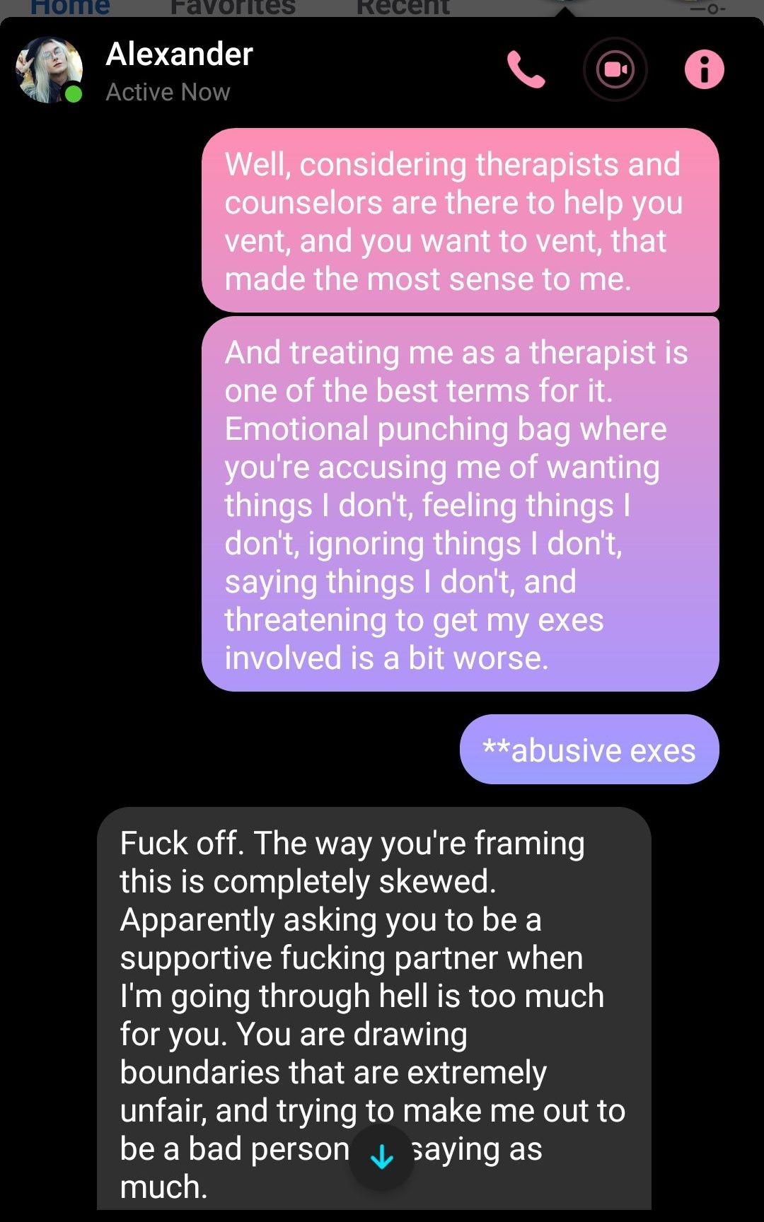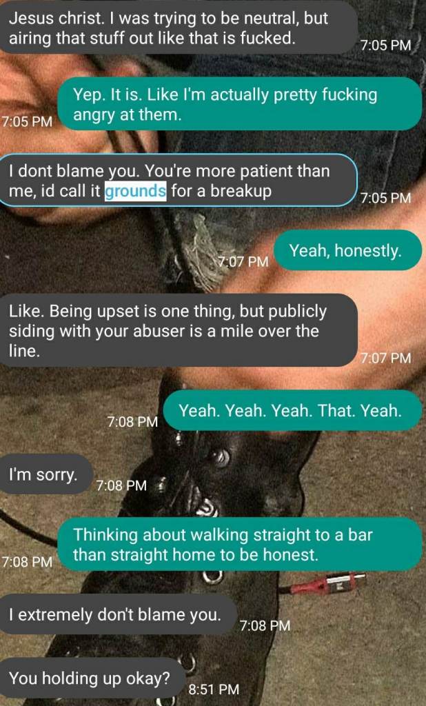 I was never in contact with Arkady’s abusers. I never disagreed with the existence of any disorder Arkady told me he had. No one had forced me on Arkady. In fact, he was excited to spend his life with me. I’d paid rent. Arkady promised me that he would be there for me to help me heal. Near the end, when I was in my own personal hell, I would’ve fucking killed for nine hours a day of his support.