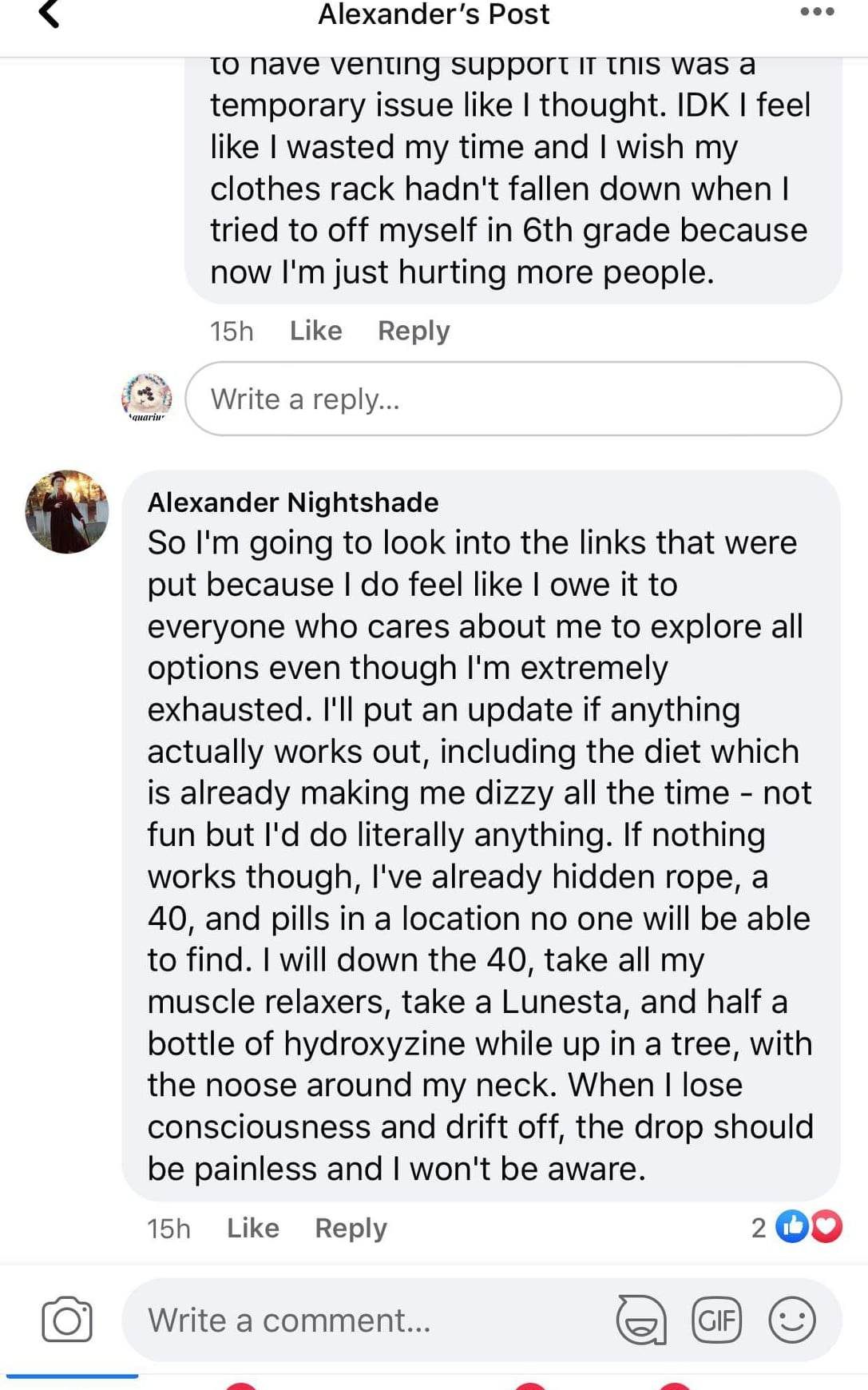 [TRIGGER WARNING: THIS NEXT SCREENSHOT IS AN EXTREMELY GRAPHIC SUICIDE THREAT ALONG WITH REFERENCES TO SELF-STARVING. VIEWER DISCRETION ADVISED. Please scroll past both rows of dots before and after the screenshot if you wish to skip it.]