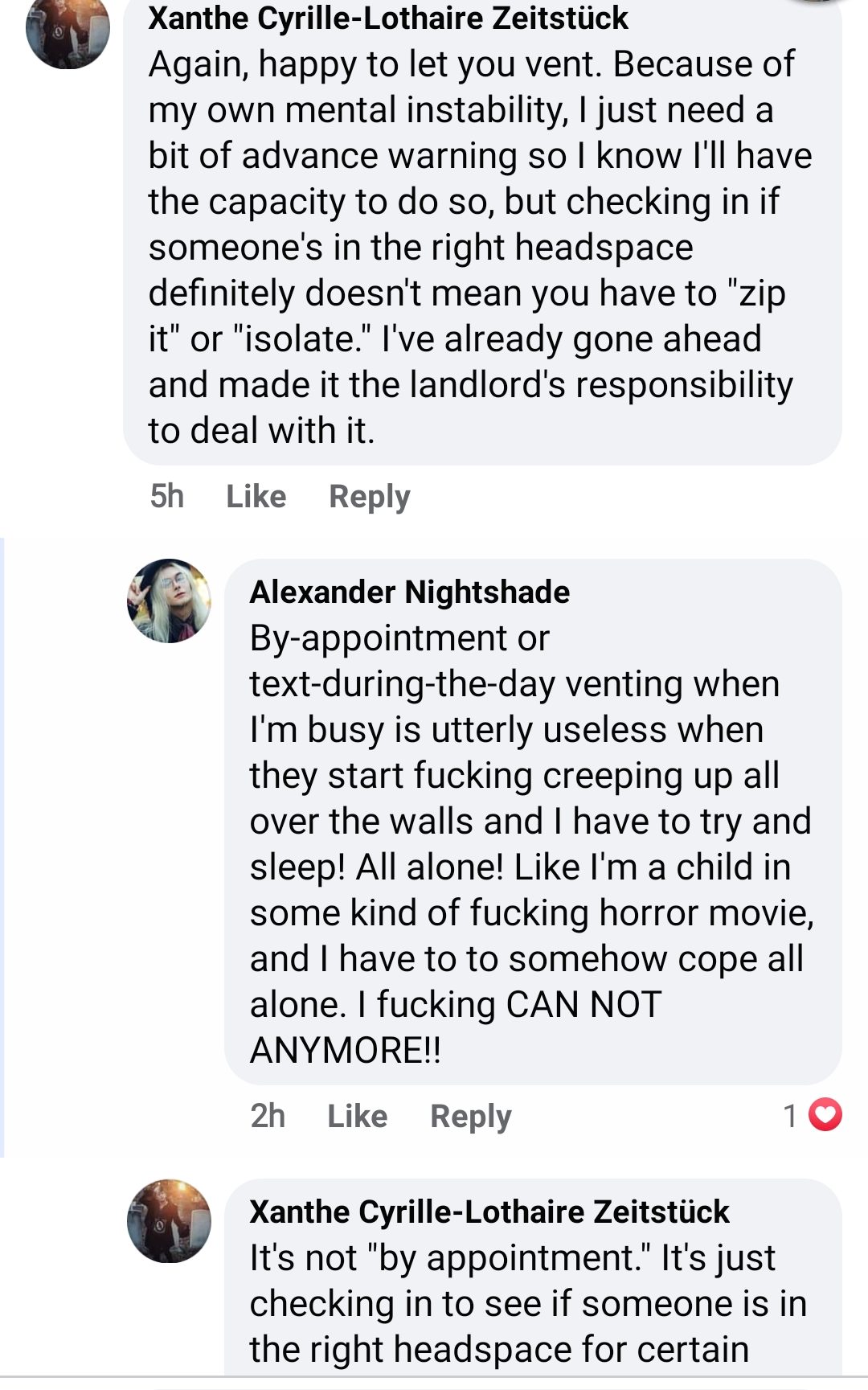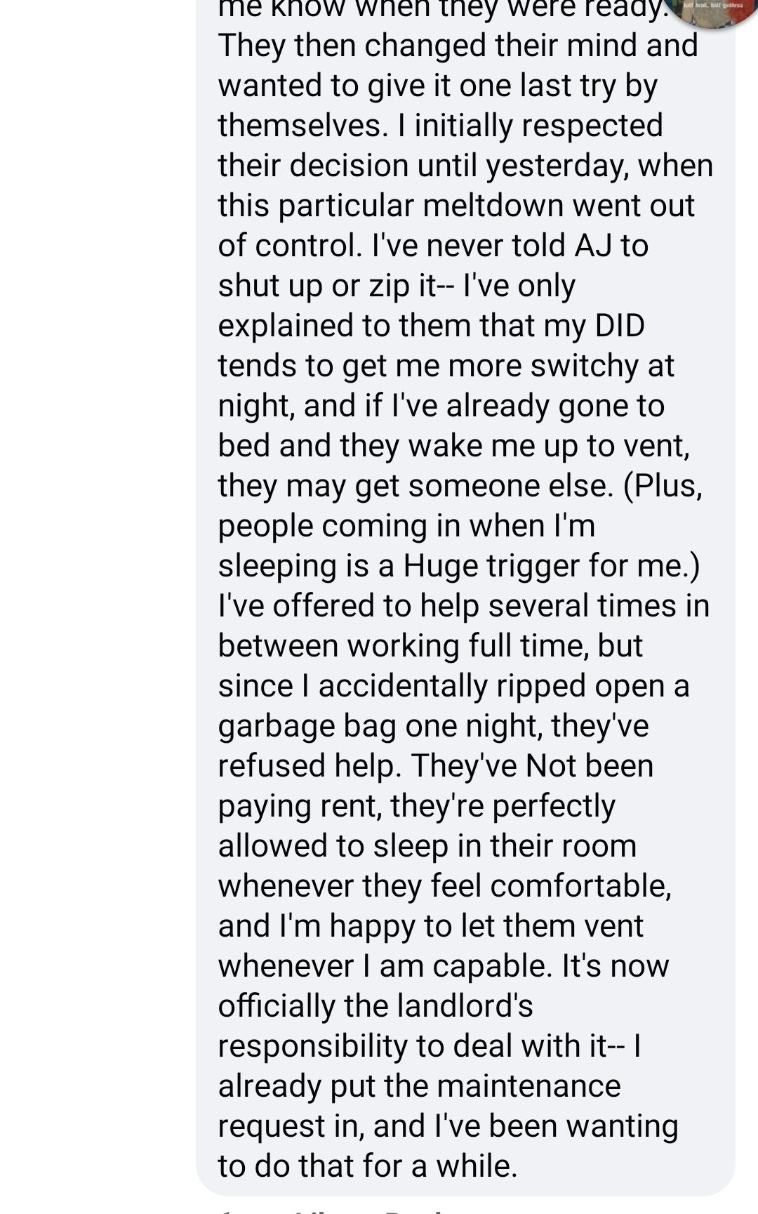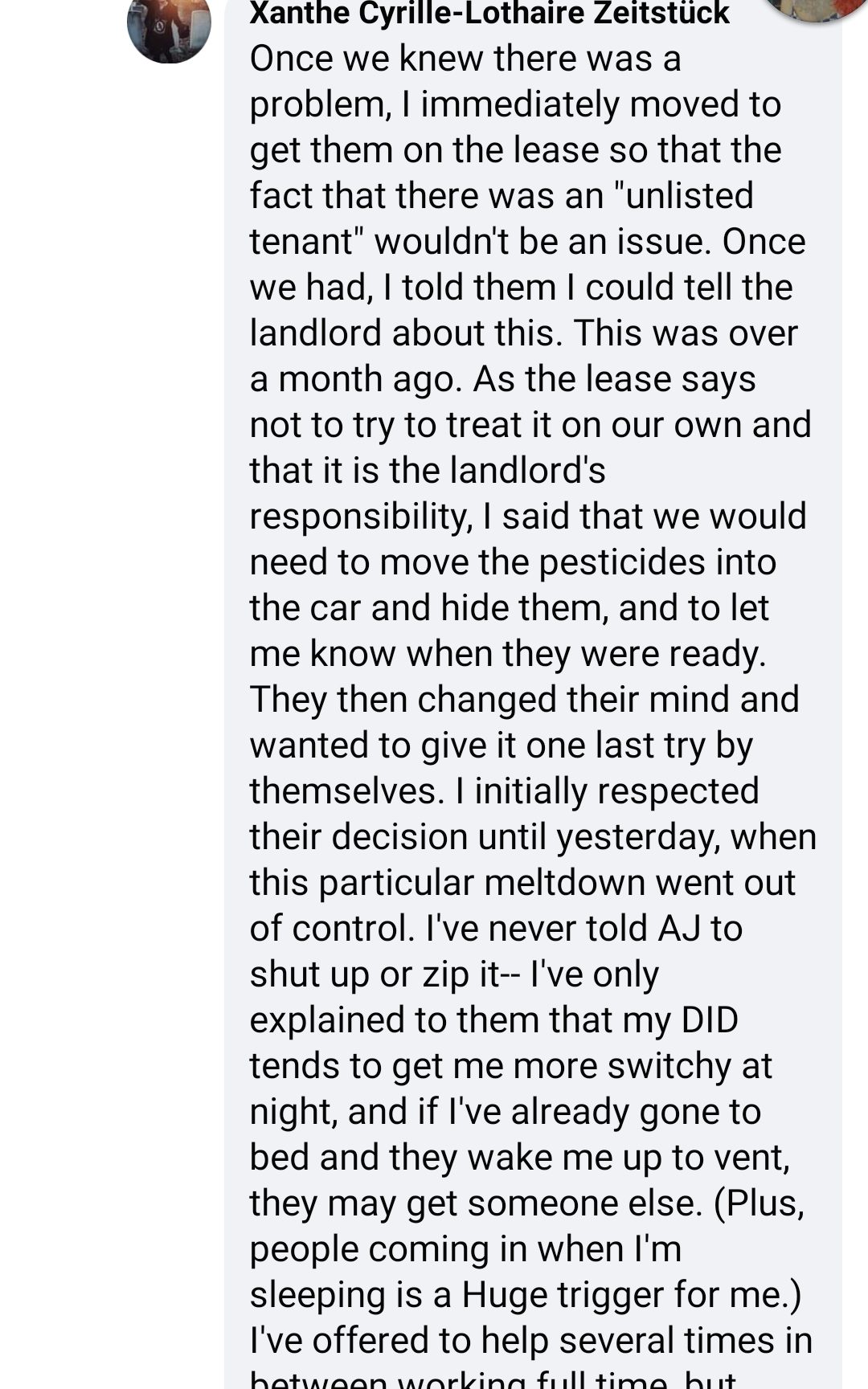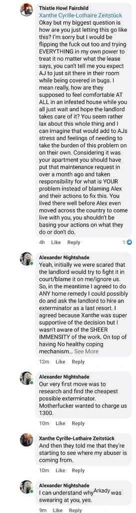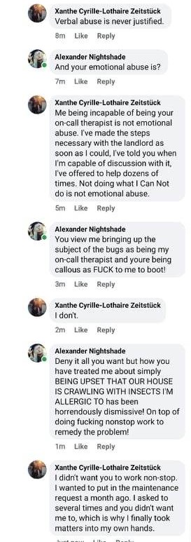 This didn’t stop there. Those in the comments were once again criticising my… existence. I didn’t actually grab screenshots, but I do remember that Thistle bitch harping on me. And someone saying, “I mean I’m also a system, but I would never emotionally abuse my partner the way Xanthe is!” “Yeah, I saw this post about Xanthe hoping living with them would be better than homelessness and thought it was gross.”
