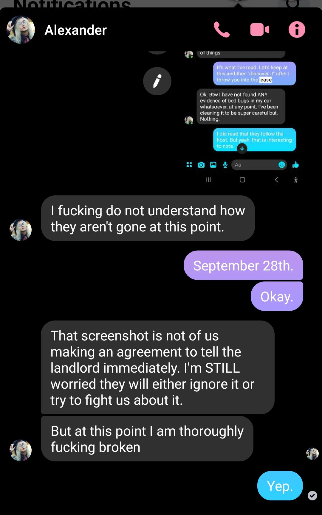 I remember sitting in the back room of my hotel job, texting back when between exasperated sighs. AJ didn’t stop, imploring me to know what could even be done in the event of their witnessing a bug when I’d already gone to bed. I thought the answer was obvious. “Kill them, preferably.” And they were the one in this relationship that had a college degree.