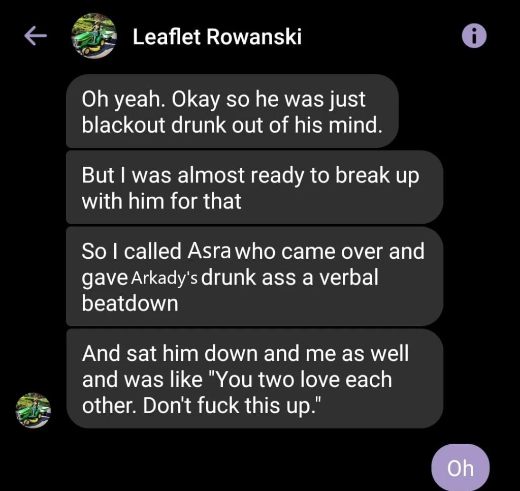 Arkady starts going on a fiery tirade about how delusional Xanthe is, about what their therapist says to them, how he has screenshots of Xanthe’s insecure admittances from October. Sage is taken aback by how Arkady is talking to Xanthe and publicly stands up for them.