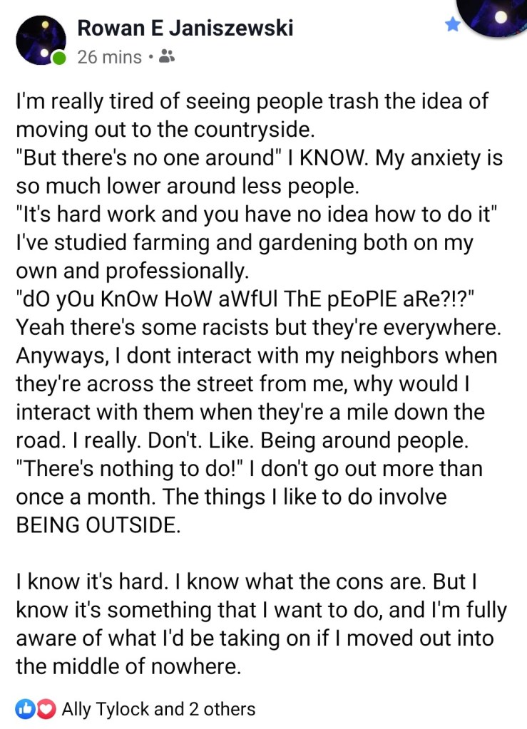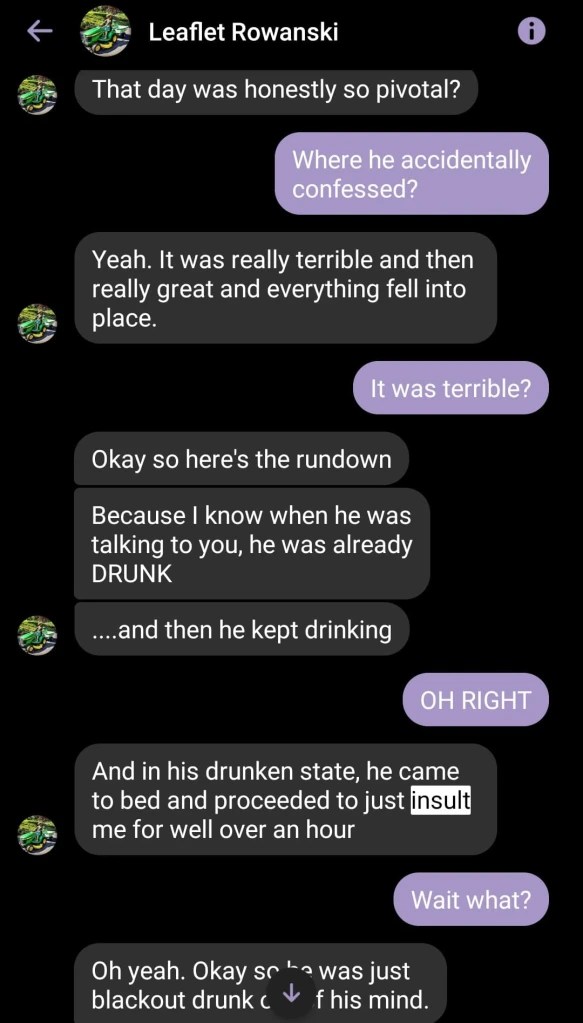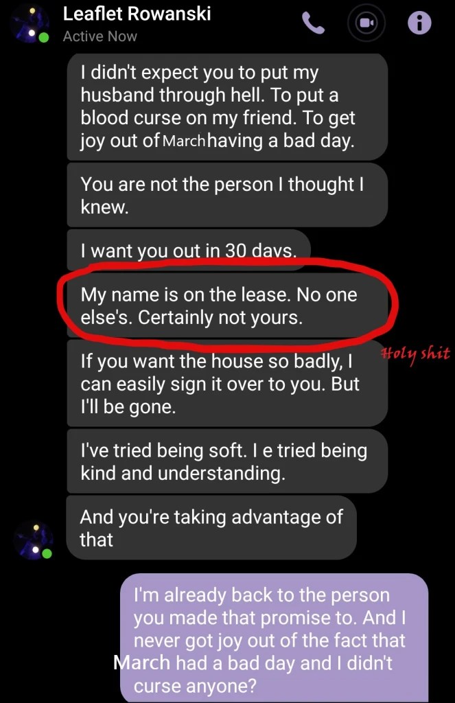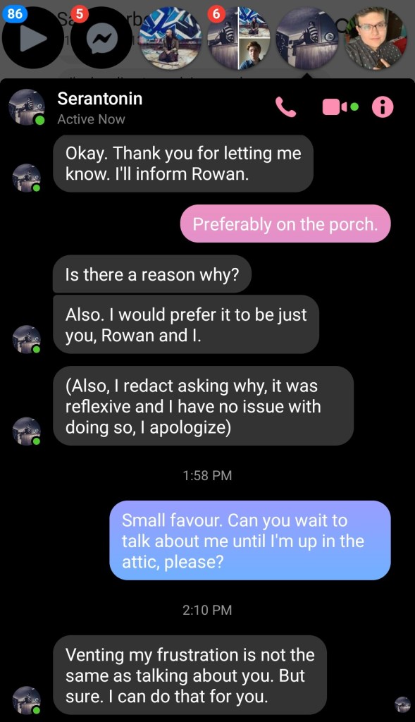 My conversation with Rowan that day, showing that I actually wasn’t pushing for him to move out. October of 2019: Xanthe’s mental illness takes a dive from having been constantly triggered and neglected. They begin to wonder if this magical-seeming manipulation pattern is a sign that they shouldn’t try to belong in the world.