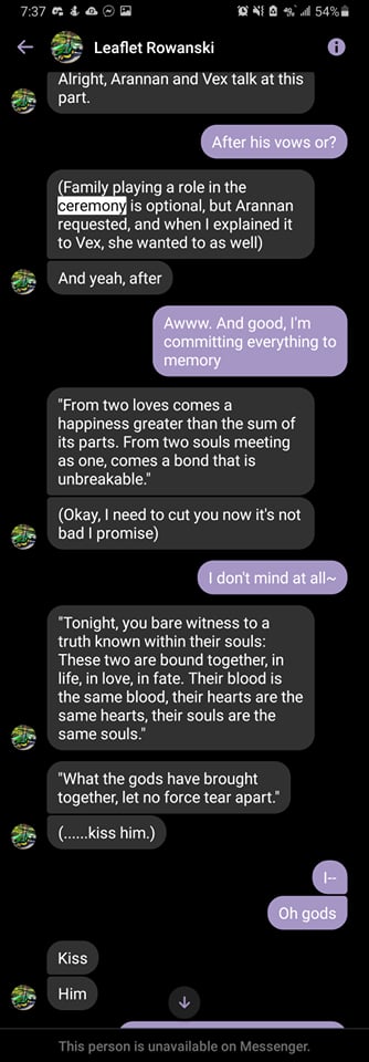 May 21st, 2019: Rowan texts Arkady and Xanthe in group chat, telling them they were getting married to Vali.