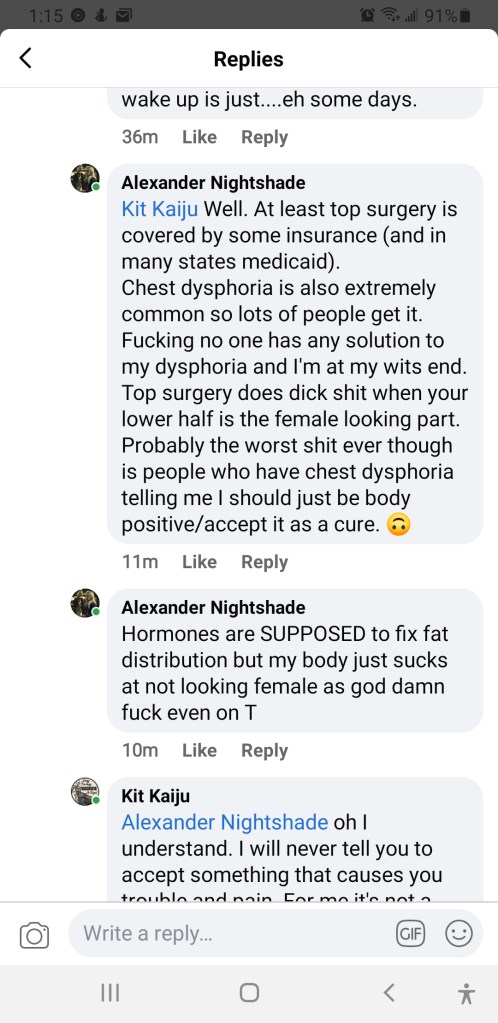 Early October, 2020: AJ begins taking their dysphoria out on Xanthe again, even yelling at Xanthe about how they ‘pass.’ Xanthe begins to hang out at The Spirit Room to cope.