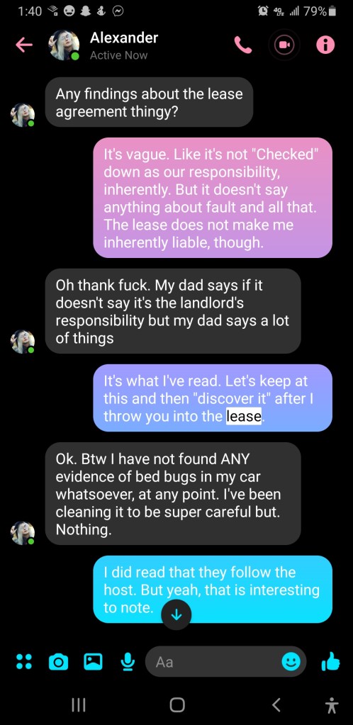 September 29th, 2020: Xanthe discovers that bedbug infestations are something the landlord will cover! They wait a while more until AJ can be added to the lease as to not get in trouble for an unlisted tenant.